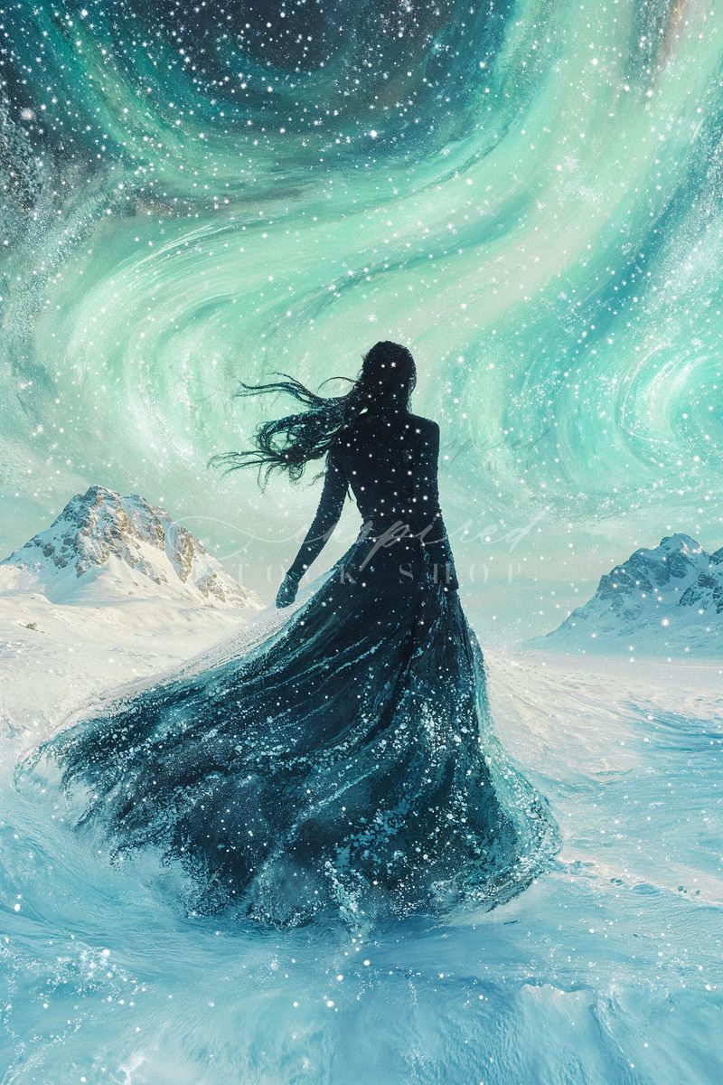 Keywords: aurora borealis, celestial, dreamlike, enchanted, enigmatic, ethereal, fantasy, glow, imagination, landscape, legend, luminous, magic, mountains, mystical, mythical, night, northern lights, otherworldly, premium, scenic, silhouette, sky, snow, surreal, winter, woman