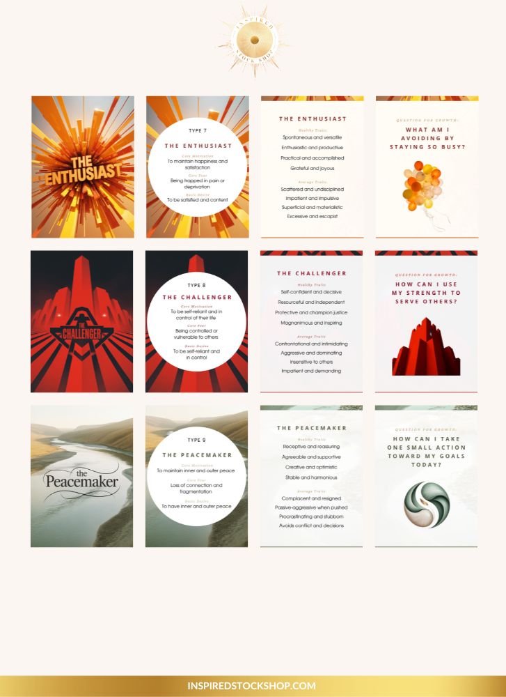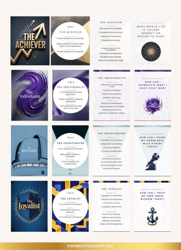 Do you have an Enneagram coaching practice? Here you’ll find a comprehensive set of professional profile cards designed specifically for client sessions and personal development work. Each type includes 4 designed Canva templates that provide insights and growth questions.