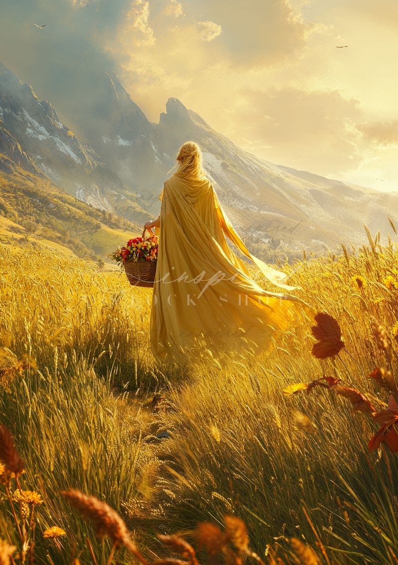 Keywords: adventure, back view, basket, blonde hair, elegant, exploration, flowers, freedom, golden hour, hiking, idyllic, landscape, long dress, mabon, majestic, meadow, mountains, nature, outdoors, peaceful, romantic, scenic, serene, sunlit, sunset, tranquil, valley, view, walking, wilderness, woman