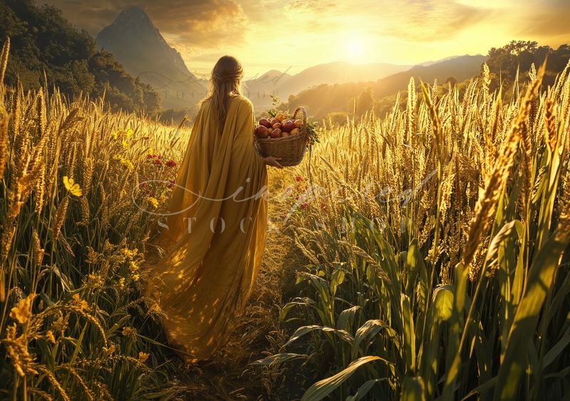 Keywords: agriculture, apples, autumn, back view, basket, cloaked, country, countryside, farming, field, golden hour, harvest, idyllic, landscape, meadow, mountains, nature, panoramic, pastoral, peaceful, rural, scenic, serenity, sunlight, sunset, tranquil, vibrant, walking, wheat field, woman