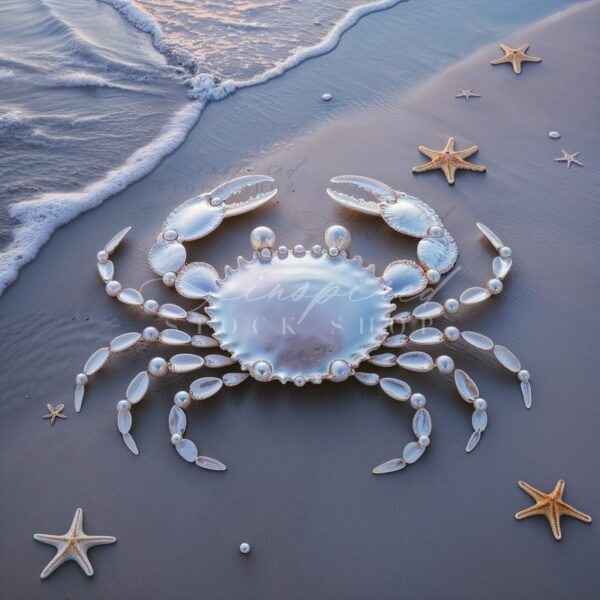 Keywords: AI, artistic, beach, calm, cancer, cancerseason, coastal, coastline, crab, creative, decoration, design, marine, maritime, motif, nature, ocean, pattern, pearl, sand, sculpture, sea, seafoam, seaside, serene, shells, shore, starfish, summer, tide, vacation, water, waves