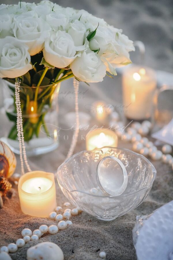 Keywords: AI, ambient, arrangement, atmosphere, beach, cancer, cancerseason, candles, celebration, centerpiece, ceremony, coastal, decoration, elegant, flowers, glass, intimate, light, love, ornament, pearls, relaxing, romantic, roses, sand, seaside, serene, style, summer, vase, wedding, white