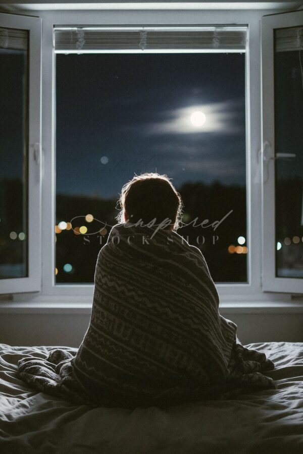 Keywords: bed, bedroom, blanket, calm, comfort, contemplation, cozy, dreamy, evening, fullmoon, gazing, indoors, mood, moonlight, night, nightscape, peaceful, person, quiet, reflection, relaxation, rest, scenery, scenic, serene, silhouette, tranquil, urban, view, window