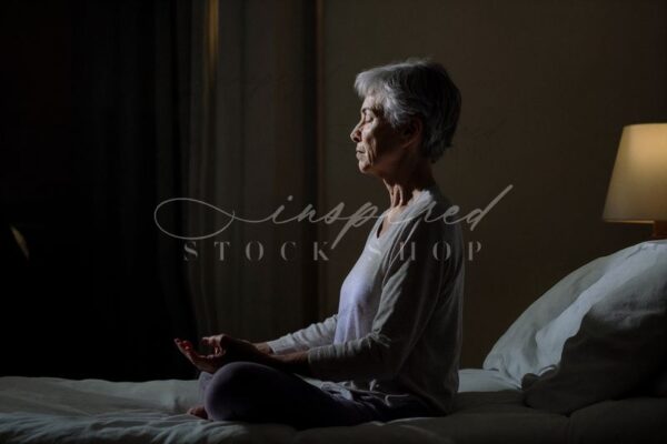 Keywords: bed, bedroom, bodymind, calm, concentration, contemplation, elderly, focus, harmony, health, indoors, lamp, meditation, mentalhealth, mindfulness, night, olderadult, peaceful, quiet, relaxation, selfcare, serenity, sideview, spiritual, stillness, stressrelief, tranquility, wellbeing, woman, zen