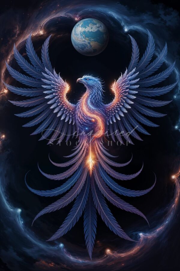 Keywords: abstract, AI, art, astrology, astronomy, bird, celestial, cosmic, dreamlike, earth, ethereal, fantasy, fire, galaxy, glow, illustration, inspirational, majestic, mythical, mythology, night, phoenix, planet, pluto, rebirth, retrograde, space, stars, symbolic, universe, visionary, wings