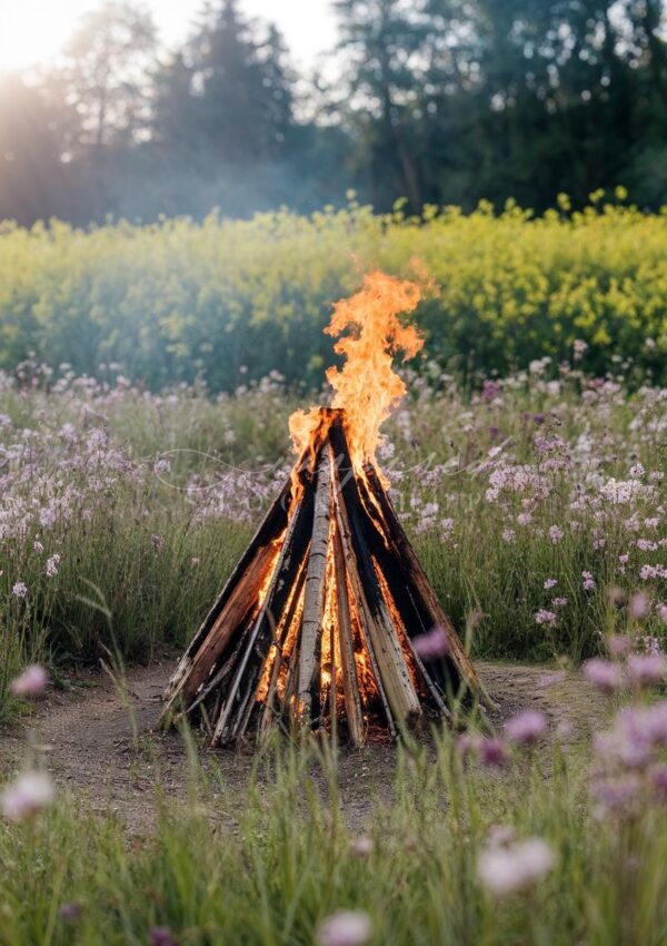 Keywords: AI, backyard, bonfire, celebration, ceremony, evening, festive, firepit, flames, flowers, forest, heat, landscape, litha, logs, meadow, nature, outdoors, peaceful, ritual, scenic, seasonal, serene, Summer Solstice, sunlight, tradition, tranquil, trees, warmth, wildflowers, wood