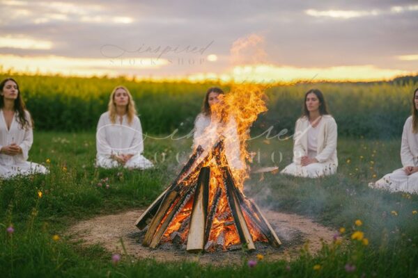Keywords: AI, bonfire, calmness, celebration, ceremony, community, cultural, evening, festivity, fields, fire, flowers, group, harmony, landscape, litha, meadow, meditation, nature, outdoors, pagan, peaceful, people, reflection, ritual, seasonal, sky, spirituality, summer, Summer Solstice, tradition, tranquility, unity