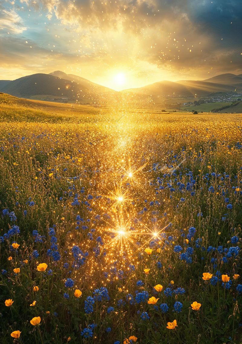 Keywords: AI, beautiful, clouds, countryside, dusk, ethereal, evening, flowers, glow, golden, hills, idyllic, landscape, light, litha, magic, meadow, natural_beauty, nature, peaceful, rural, scenic, serene, sky, sparkle, summer, Summer Solstice, sunlight, sunset, sunset_sky, tranquil, wildflowers
