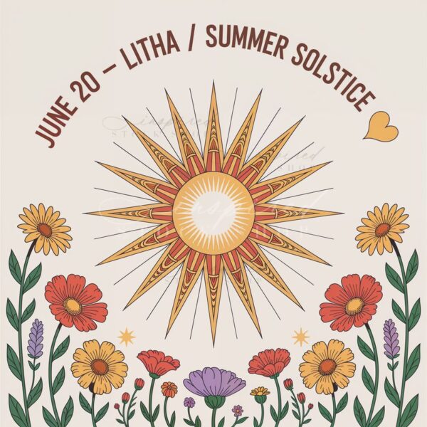 Keywords: AI, art, atmospheric, bohemian, colorful, cultural, daylight, decorative, design, embrace, ethereal, festival, floral, flowers, growth, holiday, illustration, June20, litha, nature, Pacifistic, seasonal, spiritual, Summer Solstice, SummerSolstice, sun, sunburst, sunshine, symbolic, tradition, wildflowers