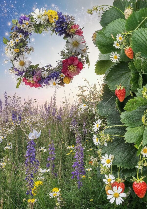 Keywords: agriculture, AI, bloom, blossom, botanical, countryside, daisy, decoration, festive, field, floral, flower, foliage, garden, greenery, harvest, idyllic, landscape, lavender, litha, meadow, nature, pastoral, petals, seasonal, serene, solstice, springtime, strawberry, Summer Solstice, sunset, vibrant, wreath