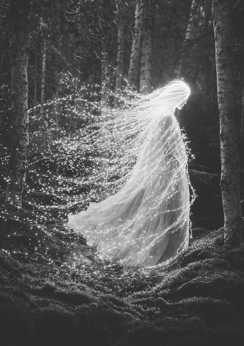 Keywords: black and white, celestial, dreamlike, enchantment, ethereal, ethereal being, fairytale, fantasy, forest, ghostly, glow, haunting, illusion, light, luminous, magic, mystery, mystical, nature, otherworldly, samhain, serene, silhouette, soft light, sparkles, spirit, supernatural, tranquil, trees, whimsical, woods