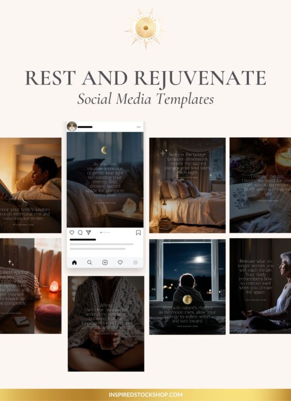 This thoughtfully designed set of 10 social media templates is perfect for wellness practitioners, life coaches, holistic healers, and spiritual entrepreneurs who want to inspire their audience with messages of rest, self-care, and balance.