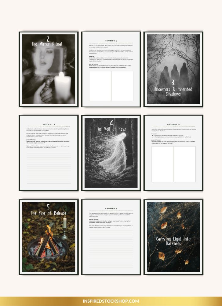 A 16-page guided Shadow Work Journal designed to help you meet and integrate the unseen parts of yourself. With poetic introductions, grounding rituals, and journaling prompts on fear, mirrors, ancestors, and release, this journal holds space for deep reflection. Paired with imagery from the Sacred Veil collection, it’s perfect for offering your community a soulful tool for healing, integration, or seasonal shadow work.